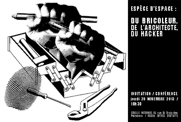 > Titre : « Espèce d'espace, du bricoleur, de l'architecte, du hacker » par le designer libre Christophe André, l'architecte Jérôme Gueneau et les membres du hackerspace.